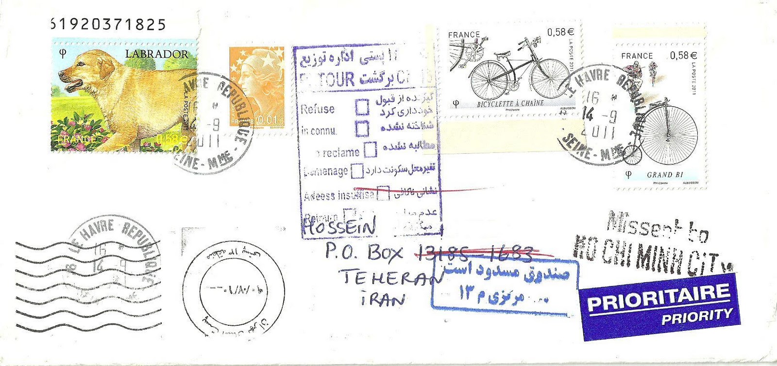 Je fus surpris de retrouver cette enveloppe que j'avais envoyée le 14 septembre 2011. Deux cachets à date manuels montrent qu'elle a été postée au Havre. Le pli affranchi au tarif étranger 2ème échelon de poids (1,75 euro) a reçu son étiquette bleue "prioritaire". Elle a reçu une oblitération mécanique iranienne en bas à gauche. Une griffe à l'encre bleue (au milieu) en français et en persan indique que l'adresse est insuffisante. En revanche je ne comprends pas bien à la griffe noire en bas à droite ("Missent to Ho Chi Minh City") !